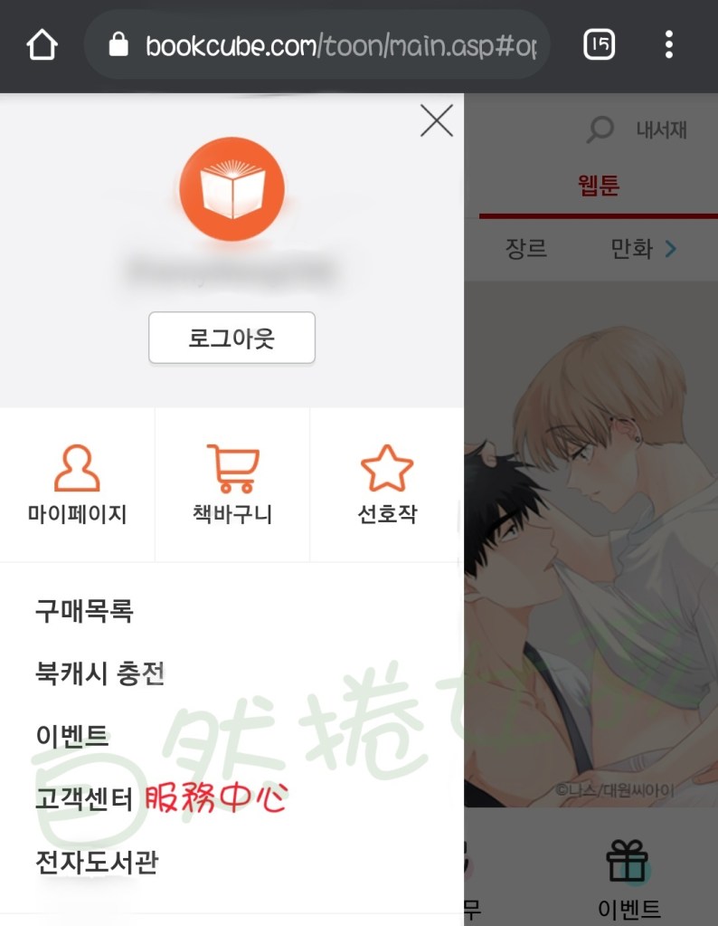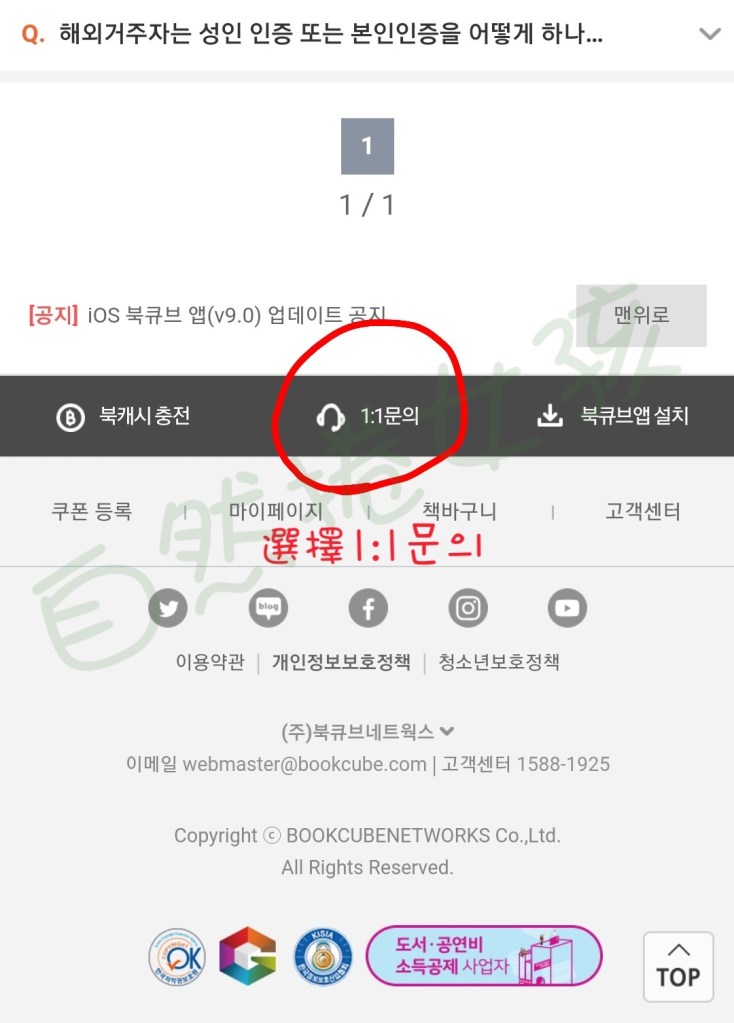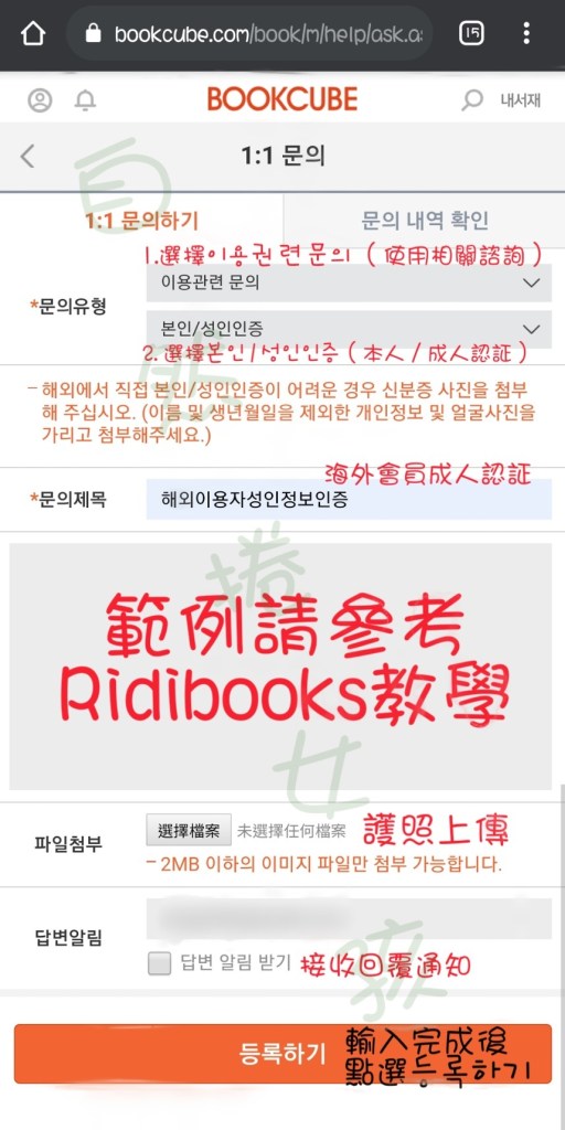 Step4. 選項一選擇이용권련 문의 ,選項二選擇본인 / 성인인증,內容範本請參閱Ridibooks 教學,最後將護照上傳,點選등록하기即完成申請。
