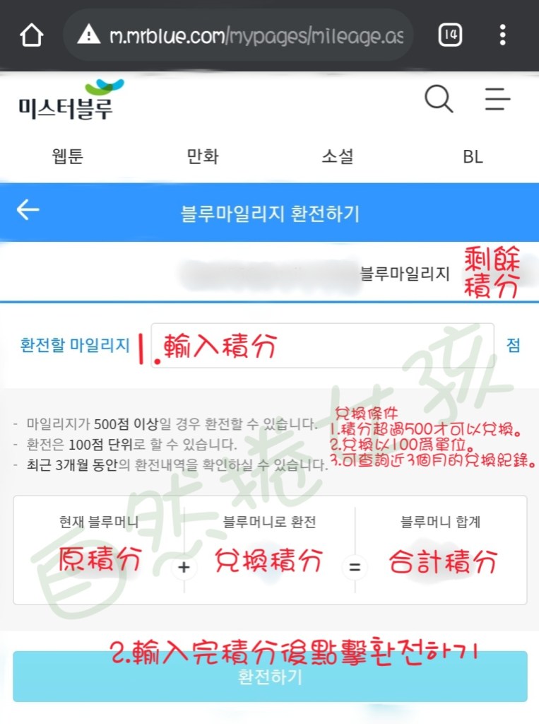 Step4. 輸入積分確認無誤後,點擊환전하기,即可將贈送的積分兌換。