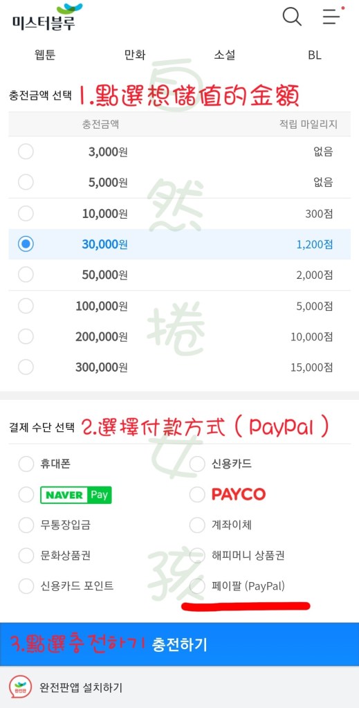 Step3. 選擇儲值金額、付款方式,並按下충전하기,再按照付款步驟即可完成儲值。