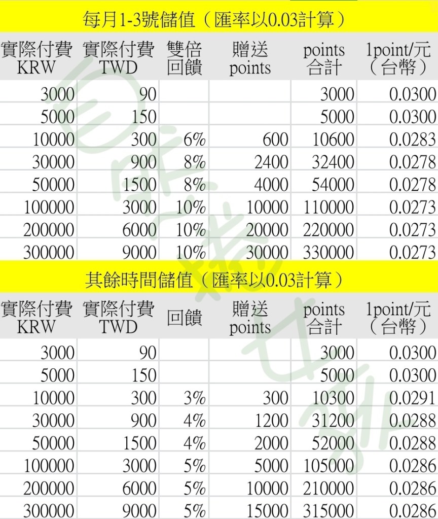 *儲值方案比較(每月1-3日儲值,贈送points雙倍)