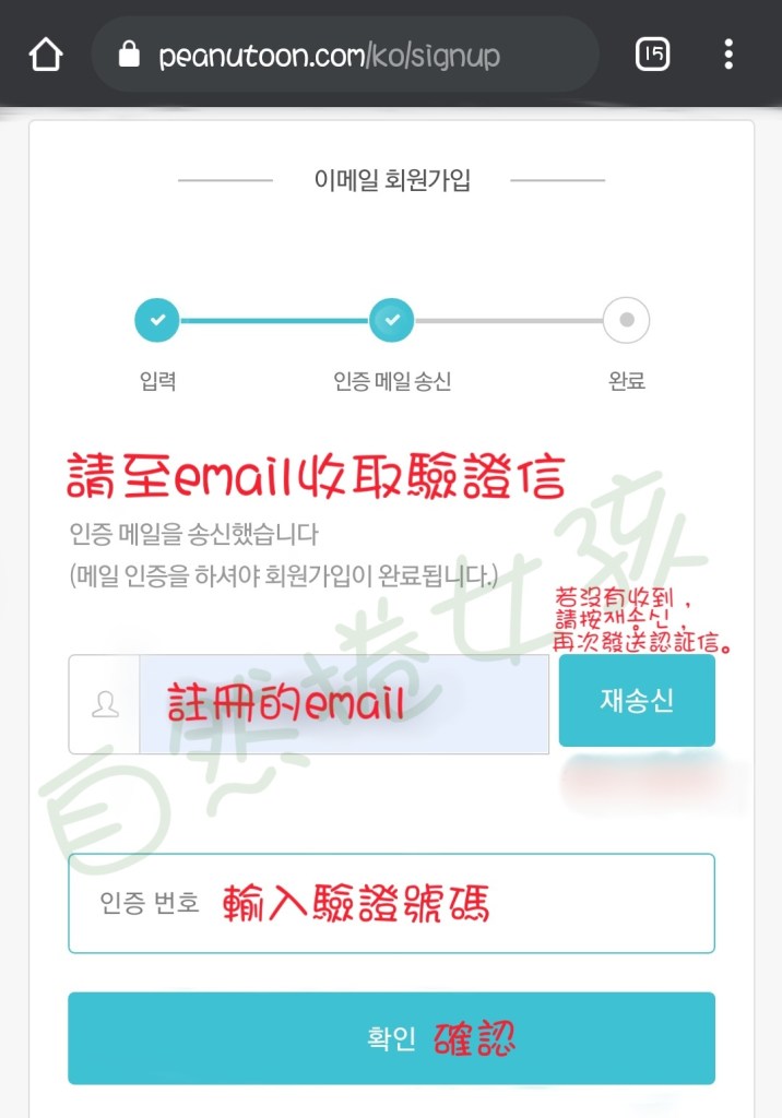 Step5. 至email收取驗證信,若沒有收到請在按一次재송신 ,下方會出現倒數時間,再將驗證碼輸入後按確認,即完成註冊。