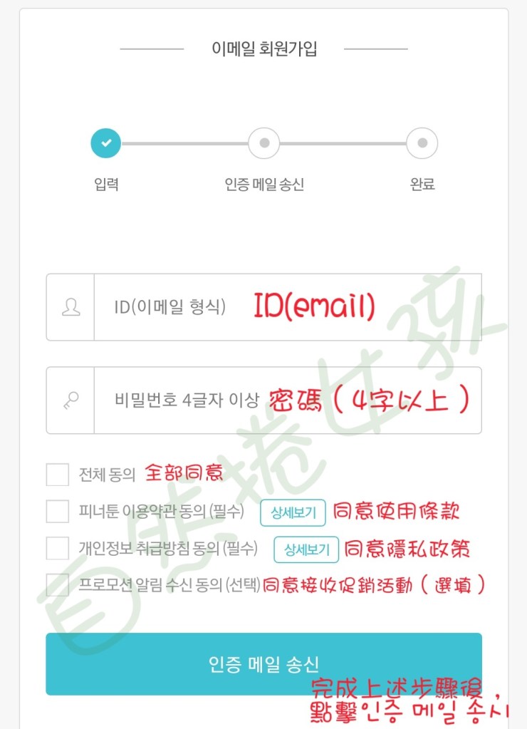 Step4. 輸入註冊資訊,完成後按下인증 메일 송시(發送驗證信)。