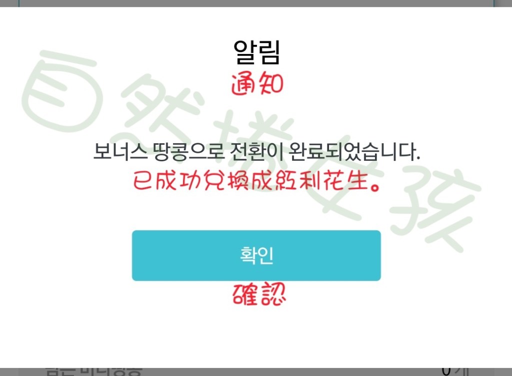 Step4. 出現下方訊息就完成兌換,按확인 就兌換完成了。