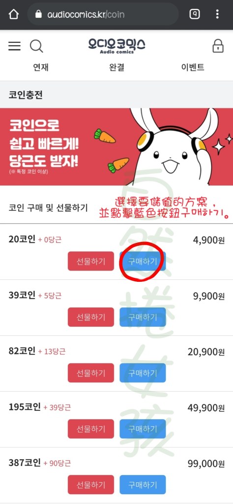 Step3. 選擇要儲值的方案,並點擊구매하기。
