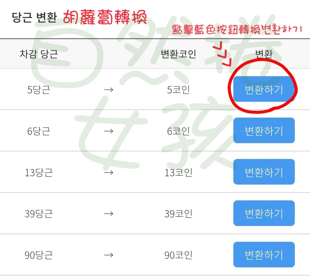 Step1. 進入儲值方案頁面,將頁面移至最下方다금 변환(胡蘿蔔轉換),選擇您要兌換的胡蘿蔔數量,按下藍色按鈕변환하기即可兌換成COIN。